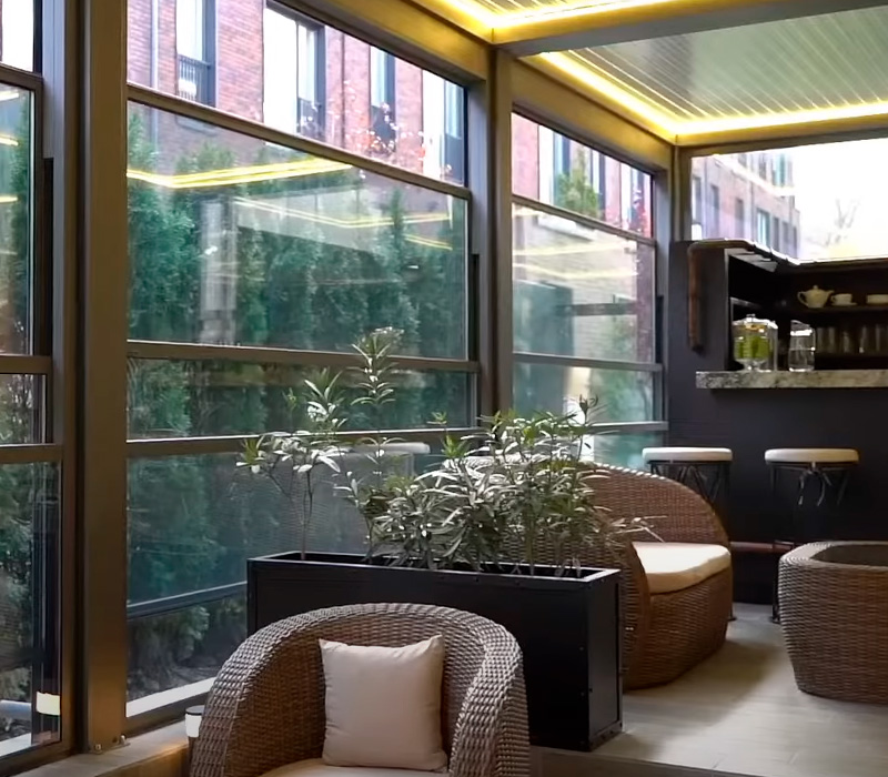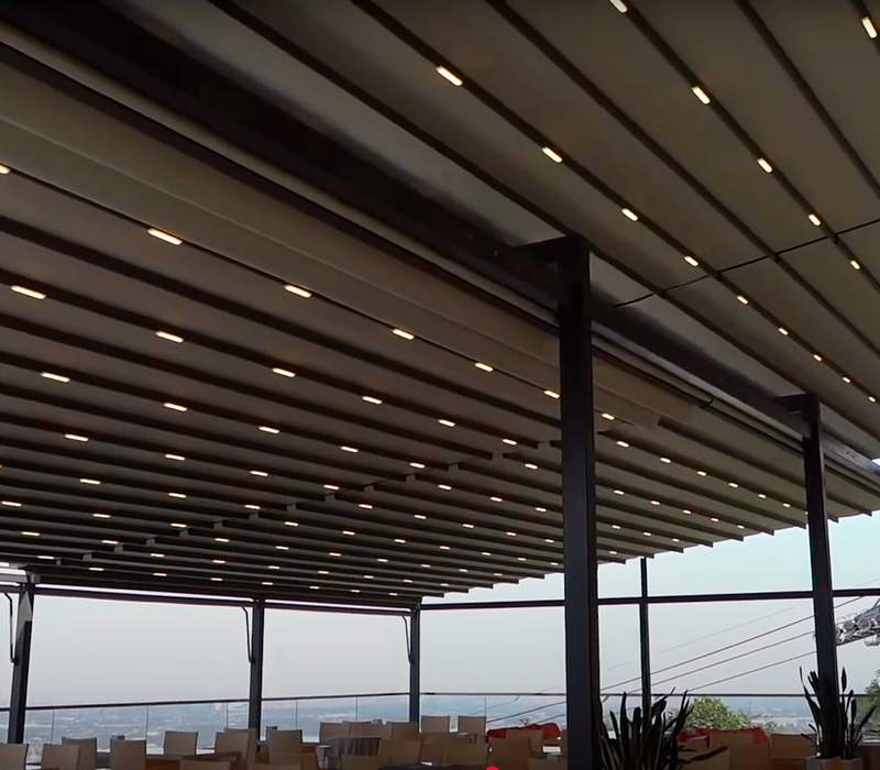 Our aluminum factory manufactures bioclimatic pergolas, retractable pergolas, and guillotine glazing systems. We provide ready-made solutions for restaurants, cafés, hotels, and private homes.
